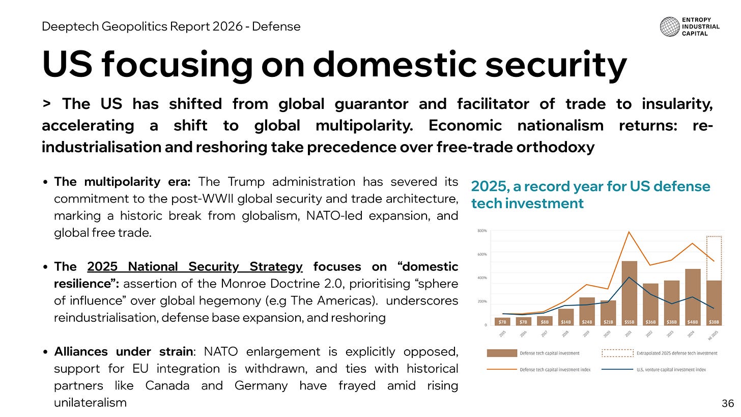 Defense: As the rules-based order erodes, hard power reasserts itself. US doctrine pivots toward domestic security and nationalism, procurement reforms favour startups over primes, and Europe moves late but decisively to define defence sovereignty under mounting threats