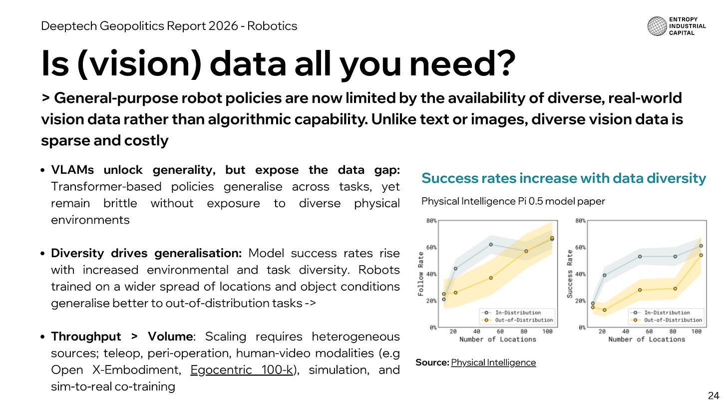 Robotics: is video (data) all you need? Video data, not VLAs, is emerging as the dominant abstraction for physical intelligence. World models displace task-level control, China controls the humanoid component stack, US capital concentrates on models, and humanoid deployment lags hype